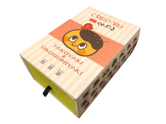 外箱はくれおーるちゃんのオリジナルデザインで、外箱のQRコードからたこ焼きやお好み焼きの焼き方動画をご覧いただけます。